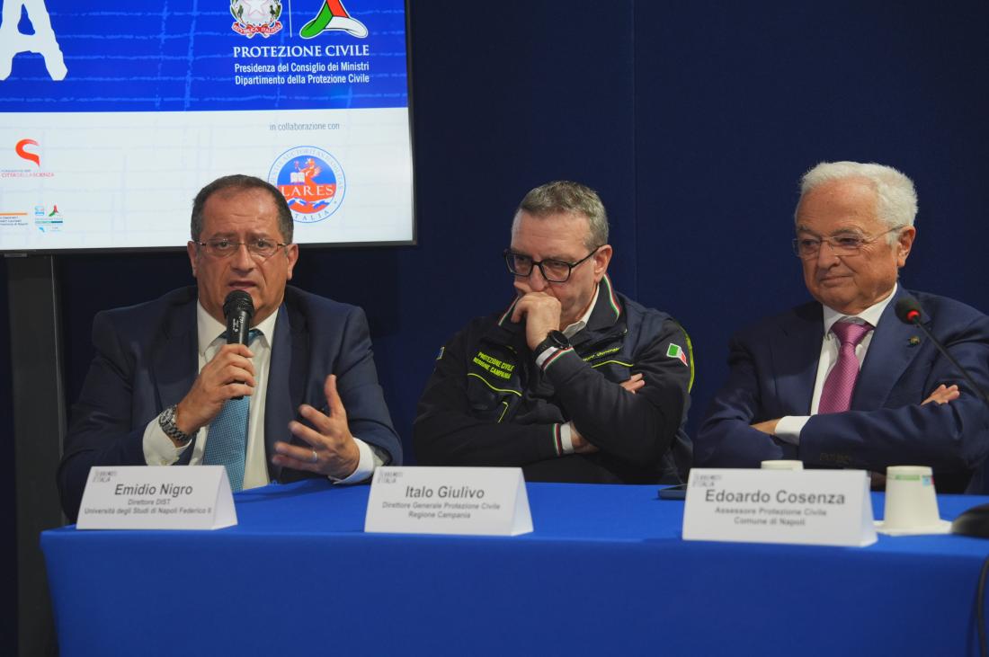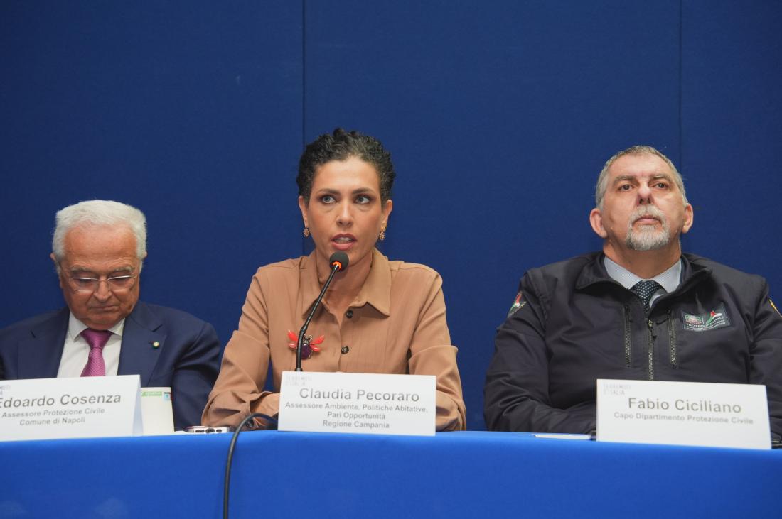 Da sinistra: Edoardo Cosenza, Assessore Protezione Civile Comune di Napoli; Claudia Pecoraro, Assessore Ambiente, Politiche Abitative, Pari Opportunità Regione Campania; Fabio Ciciliano, Capo Dipartimento Protezione Civile.