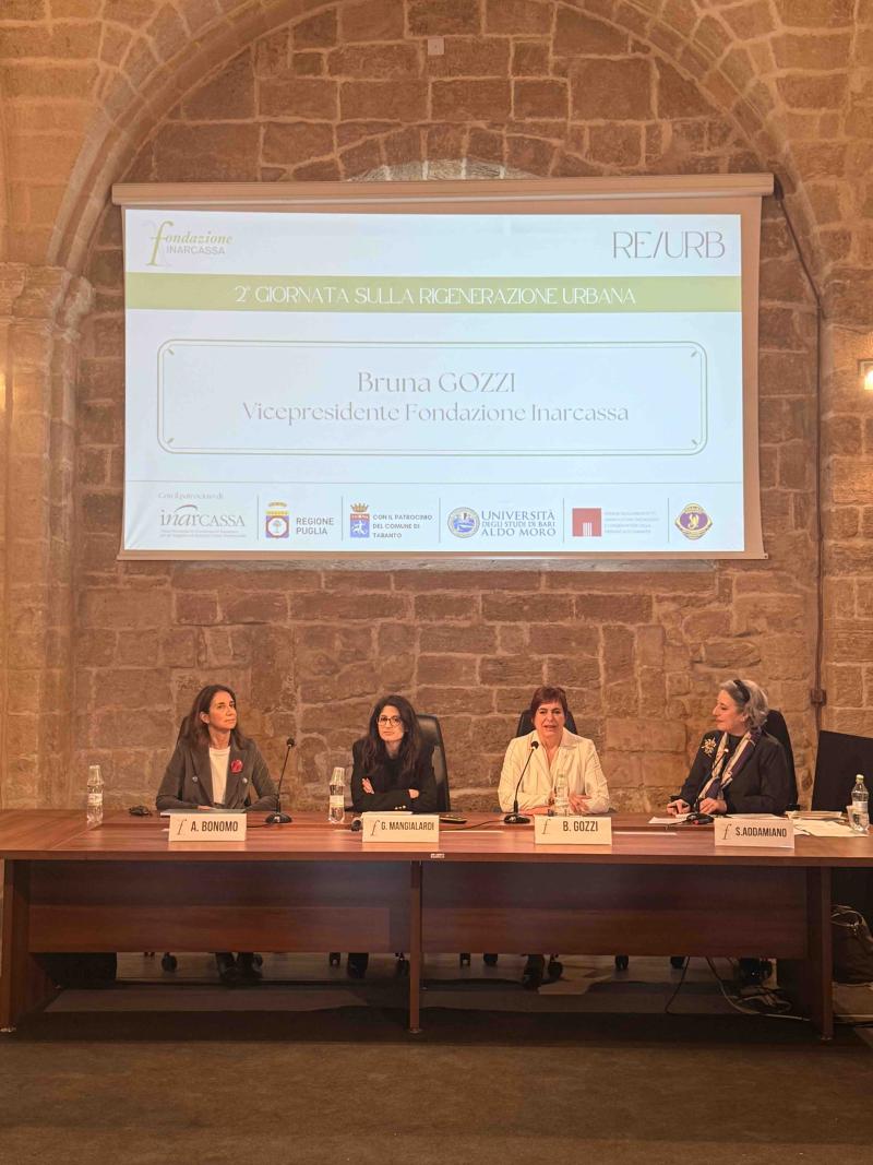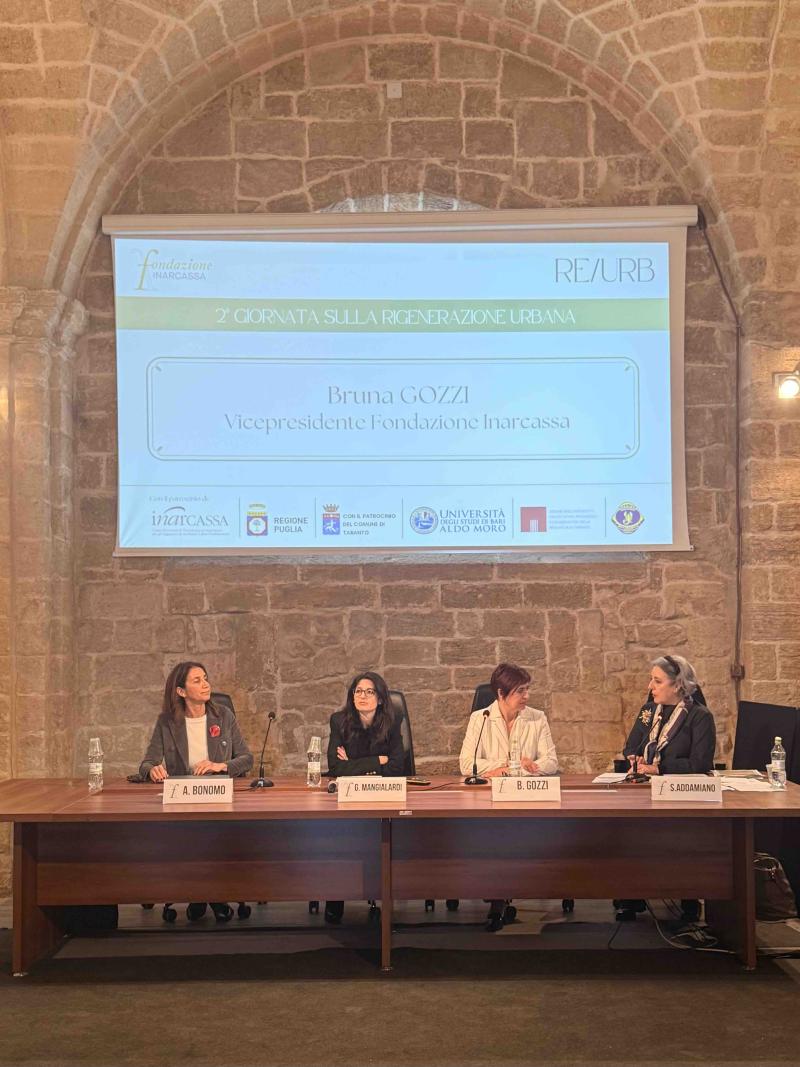 Da sinistra: Annamaria Bonomo, giurista dell’Università degli Studi di Bari; Giovanna Mangialardi, Urbanista Politecnico di Bari, Bruna Gozzi, Vicepresidente Fondazione Inarcassa, Sabina Addamiano, moderatrice dell'evento.