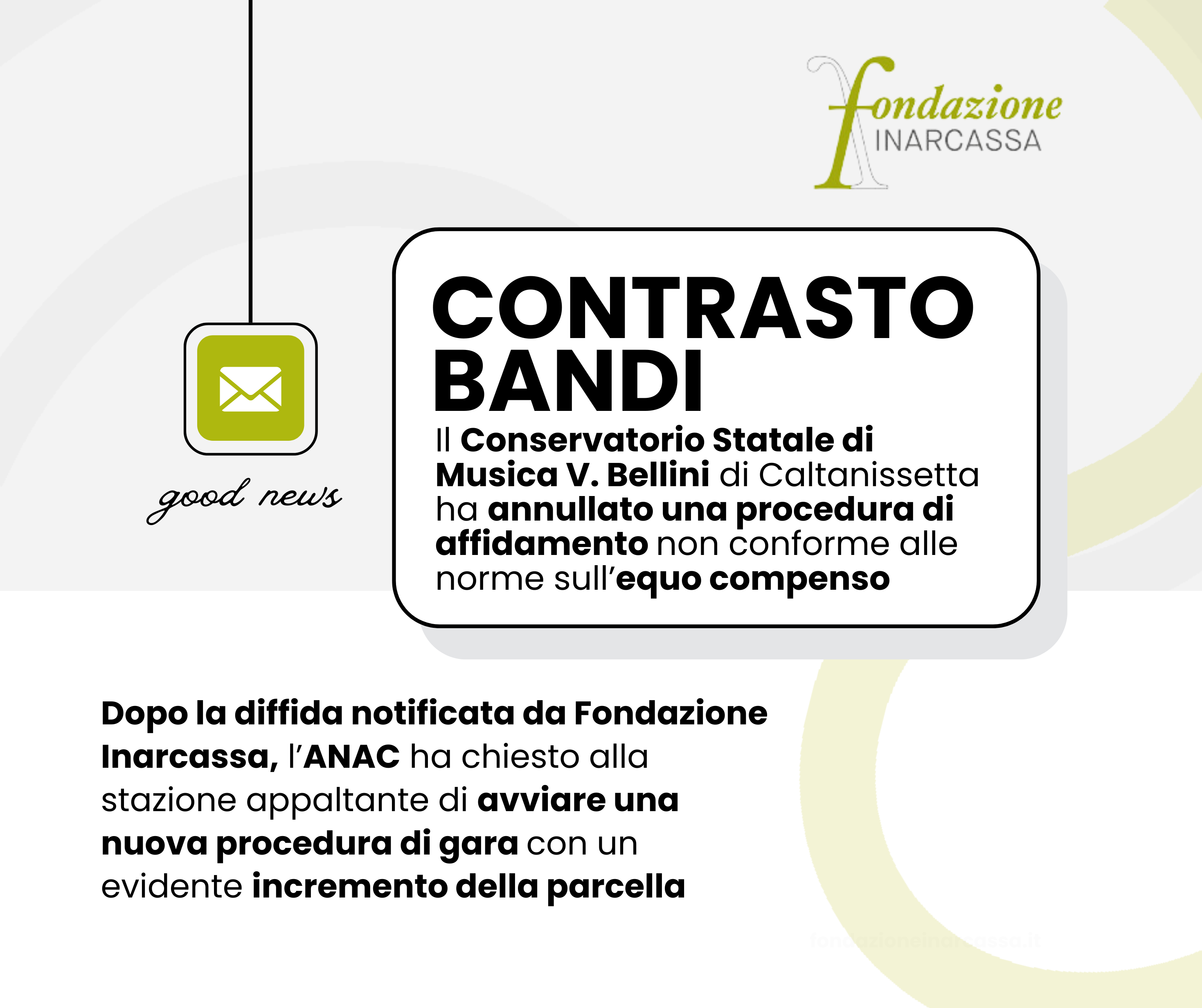 • Good news! Grazie anche all’iniziativa e all’impegno messi in campo dalla Fondazione Inarcassa, il Conservatorio Statale di Musica Vincenzo Bellini di Caltanissetta fa marcia indietro sull’equo compenso e, su diretta indicazione dell’Anac, annulla la procedura di affidamento di un servizio di architettura ed ingegneria attinente l’incarico di direzione lavori e coordinamento della sicurezza in fase di esecuzione dei lavori di riqualificazione dell'edificio che ospita il Conservatorio.  Con la delibera n. 167/2025, l’Autorità Anticorruzione ha giudicato, infatti, non conforme alle disposizioni normative vigenti in materia di equo compenso la procedura indetta dal Conservatorio; pertanto, l’Anac ha chiesto alla stazione appaltante di avviare una nuova procedura di gara con un evidente incremento della parcella. Nella diffida notificata dalla Fondazione Inarcassa si lamentava l’insufficienza dei corrispettivi professionali nonché l’errata modalità di calcolo dei compensi per le voci relative alla Direzione Lavori e al C.S.E. Non va trascurato, inoltre, che, secondo una valutazione formulata dalla Fondazione Inarcassa, la stazione appaltante ha “inopinatamente ed illegittimamente ridotto la base d’asta al fine di restare al di sotto della soglia dei 140.000 euro” per rimanere nell’ambito dell’affidamento diretto. L'Osservatorio della Fondazione Inarcassa sull'attività di contrasto ai bandi irregolari registra un decremento delle segnalazioni da parte dei professionisti. È un segnale positivo perché significa che le stazioni appaltanti sono sempre più attente ai temi dell'equo compenso per i servizi di architettura e ingegneria, ed anche questa è un'ottima notizia.   Leggi la la delibera dell'Anac
