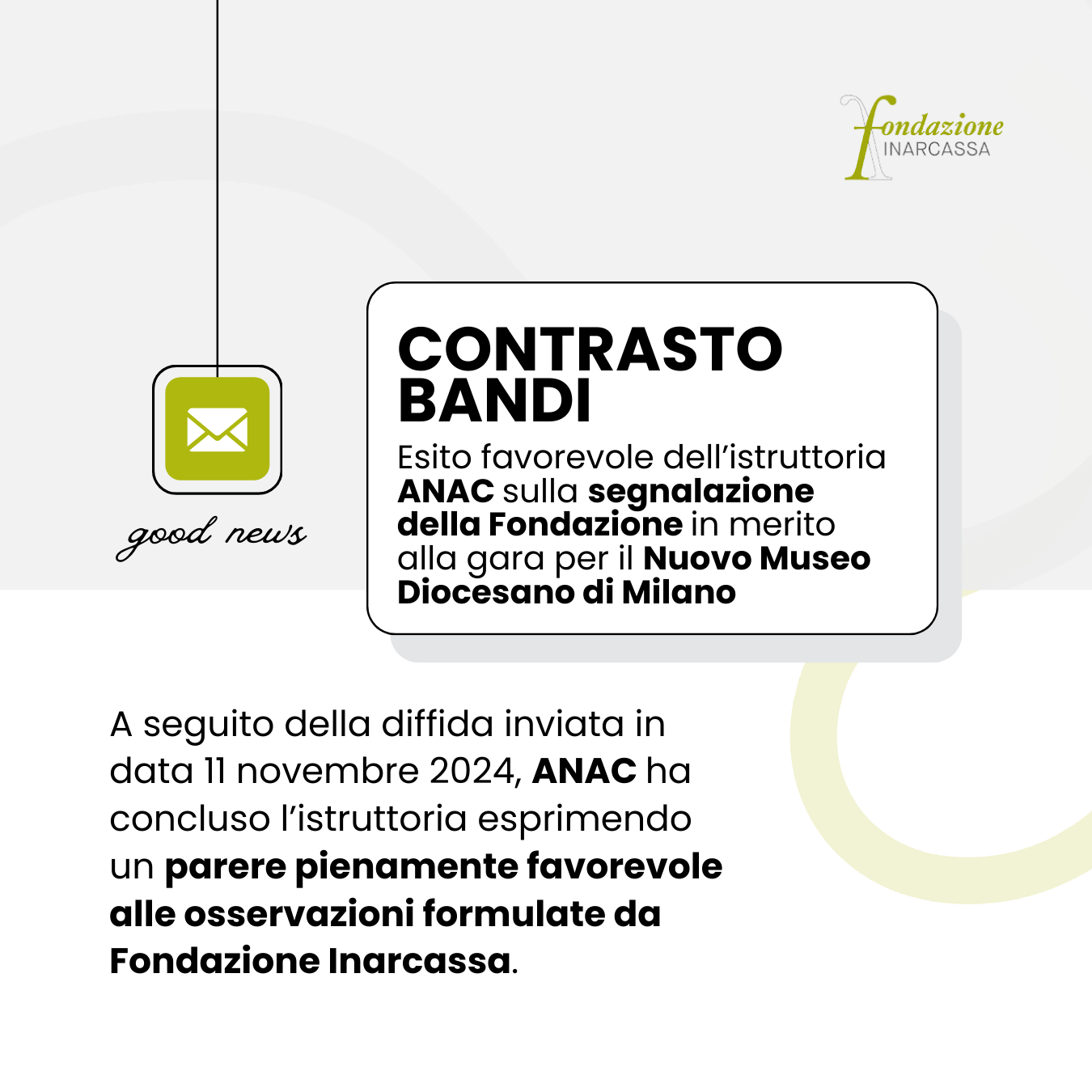 • Esito favorevole dell’istruttoria ANAC sulla segnalazione della Fondazione in merito alla gara per il Nuovo Museo Diocesano di Milano La Fondazione Architetti e Ingegneri liberi professionisti iscritti Inarcassa comunica che, a seguito della diffida inviata in data 11 novembre 2024 all’Opera Diocesana per la Diffusione e la Preservazione della Fede, relativa alla procedura di gara per l’affidamento dei servizi tecnici di progettazione del Nuovo Museo Diocesano (CIG: B3660C9D3D), l’Autorità Nazionale Anticorruzione (ANAC) ha concluso l’istruttoria esprimendo un parere pienamente favorevole alle osservazioni formulate dalla Fondazione. Nell’atto a firma del Presidente ANAC del 18 giugno 2025, sono stati riconosciuti e confermati i seguenti profili di illegittimità: Mancata redazione del Documento di Indirizzo alla Progettazione (DIP) da parte del RUP, in violazione dell’art. 41 del Codice dei Contratti. Frazionamento ingiustificato della progettazione tra soggetti diversi, compromettendo l’unitarietà e la coerenza dell’intervento. Attribuzione di poteri di approvazione a soggetti privati, lesiva dell’autonomia professionale del progettista e contraria alle disposizioni del Codice. Requisiti di partecipazione sproporzionati, tali da limitare la concorrenza e la partecipazione alla gara. L’ANAC ha inoltre rilevato criticità nella clausola sulla copertura economica dell’intervento, che potrebbe generare incertezza sull’esecuzione del servizio. La Fondazione esprime soddisfazione per l’esito dell’istruttoria, che conferma la validità delle azioni intraprese a tutela della libera professione e della correttezza delle procedure pubbliche. Questo risultato rafforza il ruolo della Fondazione come ente esponenziale e presidio di legalità e trasparenza nel settore dell’ingegneria e dell’architettura.