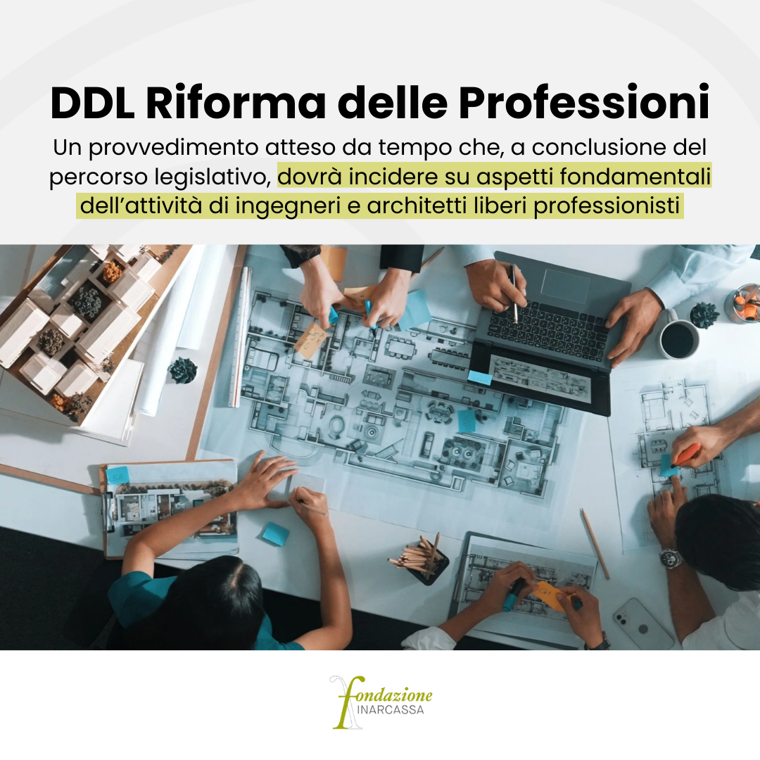 • Fondazione Inarcassa accoglie con favore l’approvazione da parte del Consiglio dei Ministri del disegno di legge delega sulla riforma delle professioni ordinistiche. Un provvedimento atteso da tempo, che, a conclusione del percorso legislativo, dovrà incidere su aspetti fondamentali dell'attività dei liberi professionisti, tra cui: miglioramento dell’equo compenso, delimitazione della responsabilità professionale, semplificazioni per favorire la diffusione delle Società tra Professionisti (STP). Come sottolinea il Presidente Andrea De Maio: “Si tratta di un provvedimento che riconosce il valore sociale ed economico delle professioni tecniche e che va nella direzione di una maggiore tutela, dignità e sostenibilità del lavoro dei liberi professionisti". Il nostro impegno prosegue, per contribuire al miglioramento del testo durante l’iter parlamentare, così da garantire risposte concrete e attese da tutta la comunità professionale. Leggi il testo del DDL Leggi il comunicato stampa