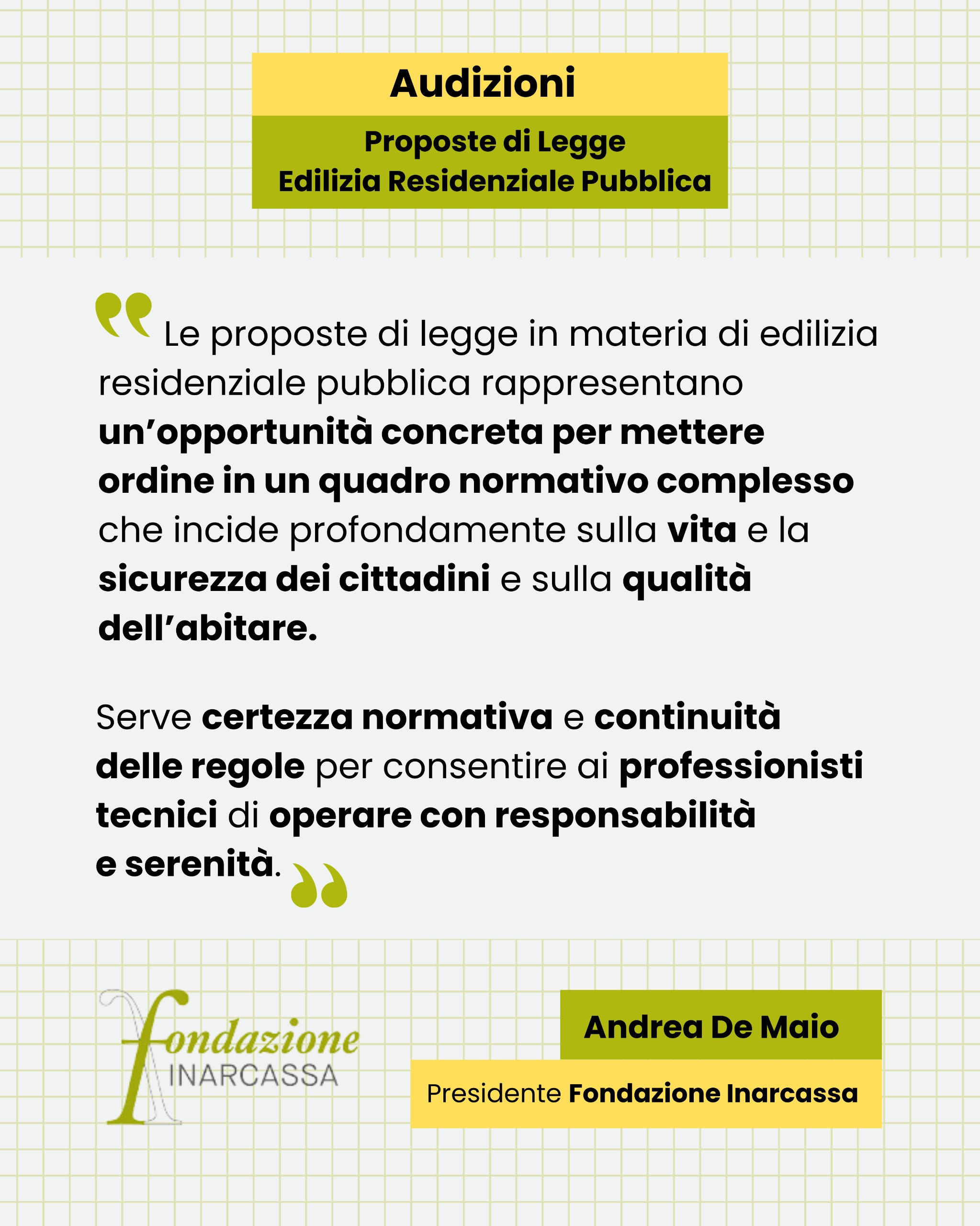 • “Le proposte di legge in materia di edilizia residenziale pubblica rappresentano un’opportunità concreta per mettere ordine in un quadro normativo complesso che incide profondamente sulla vita e la sicurezza dei cittadini e sulla qualità dell’abitare”. Così Andrea De Maio, Presidente della Fondazione Inarcassa, nel corso dell’audizione odierna davanti alla Commissione parlamentare chiamata ad esaminare i testi sulla materia (primi firmatari Santillo, Furfaro e Grimaldi). Leggi il comunicato stampa Guarda l'intervento completo (min 10:00)